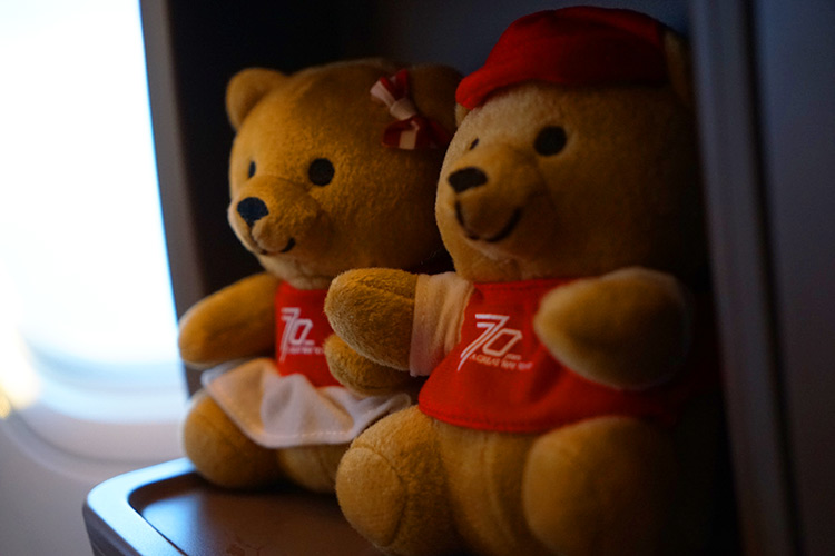 着陸まであと1時間ほどあり、少し退屈にしているとシンガポール・ガールさんがクマのぬいぐるみを持ってきてくれました。70周年記念ということでビジネスクラス搭乗客に配布しているようです。路線により配布するものは異なるようですが、時間を退屈させない演出に感じました。