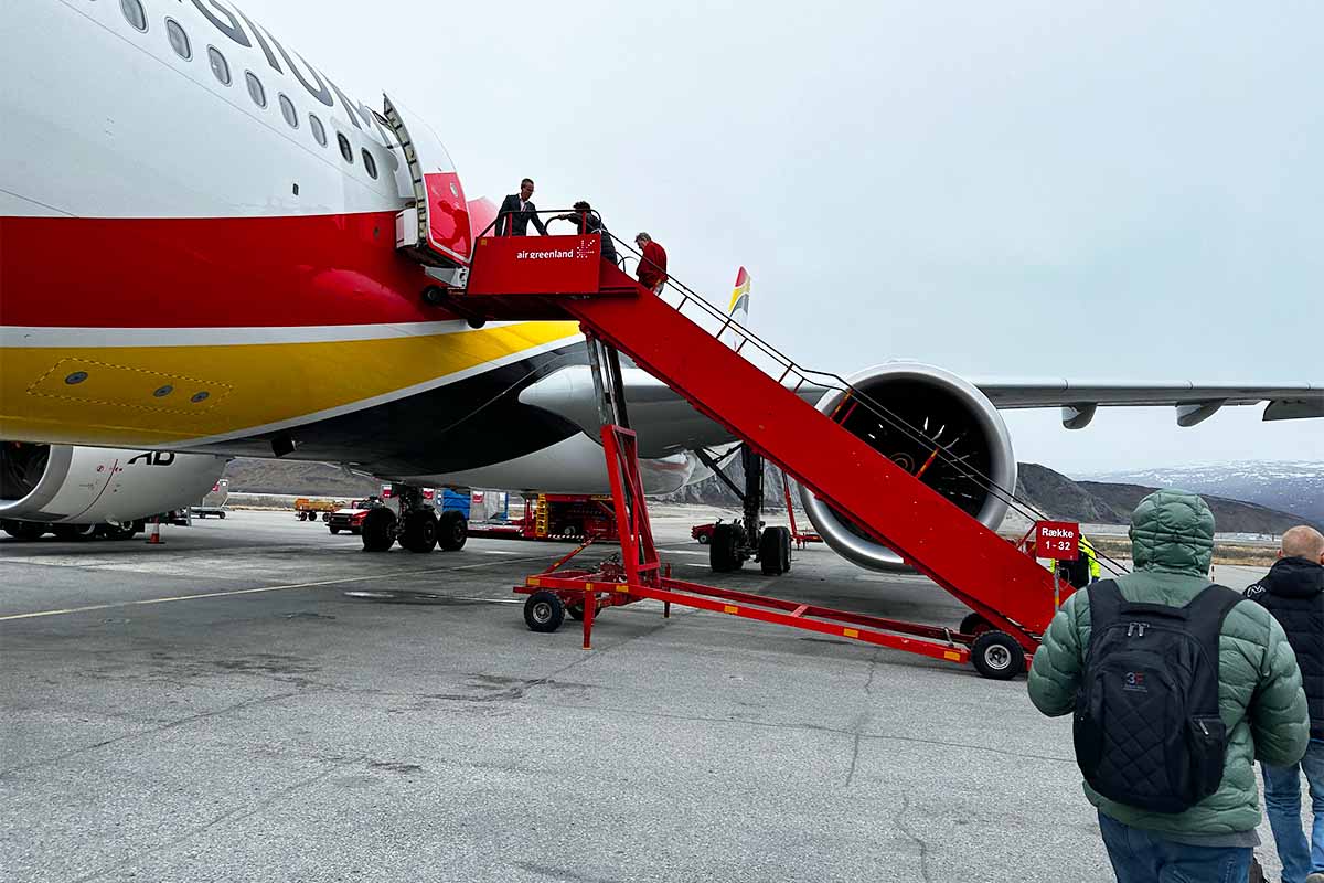 マイルやプレミアムポイントは積算されず、割高なエア・グリーンランドのエコノミークラスで退屈するかなと思いましたが、同社にとっては予想外である代替機の運用となりました。運航と機内サービスはエア・グリーンランドのスタッフでありましたが、エア・ベルギーのゼッケンベストを身に着けたエンジニアらしき人がカンゲルルススアーク空港に多くいたので、はじめという事でサポートをしていたようです。