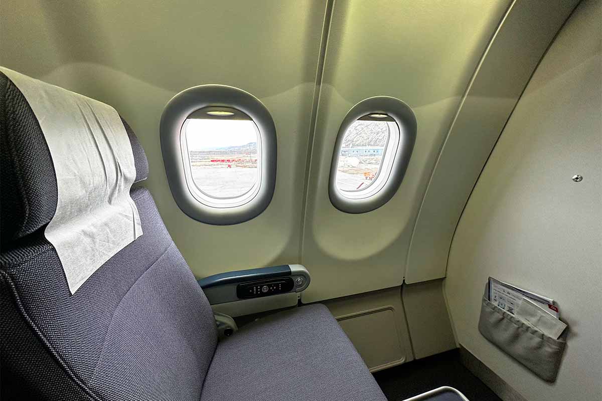 折角のグリーンランドなので、景色を楽しむため、エコノミークラスで隣席が空いている窓側の方が良いと思っていました。しかし、通路側とは言え、最前列のプレミアムクラスシートなので、すかさず座席指定。チェックイン状態にしました。