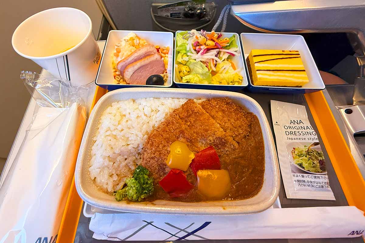 ただ、今回は食欲がなかったのと作業があったのでスイートラウンジでは食べなかったのですが、さすがにお腹がすいてきた夕時に、機内食でカレーと食欲がそそられてしまいました。