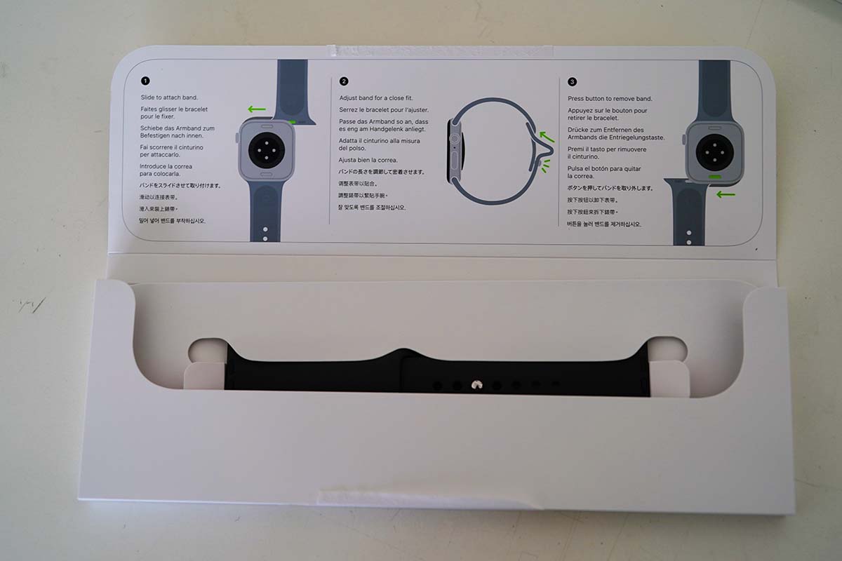 本体、バンド分離方式の包装も変わりません。Apple製品の化粧箱はシンプルで変わらないようにも見えますが、年々、サステイナブルとかエコとかで結構安っぽくなっているようにも見えます。化粧箱を毎日持ち歩くわけではないので良いのですが、儲けるのは大変というのを感じてしまいました。