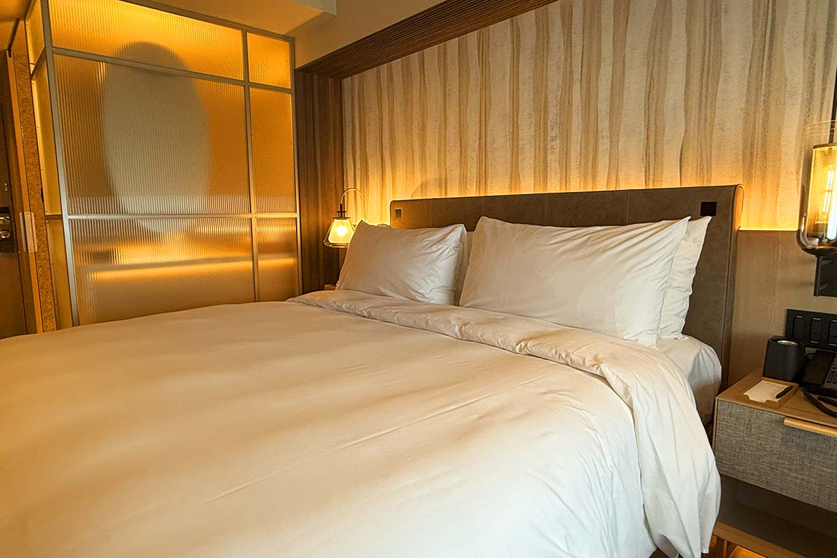 11月に滞在した際は混んでいたため、アップグレードはほぼないのですが、それでもデラックスルームにはしてくれました。部屋の広さはキングと同じでありますが、ベッドサイドのテーブルは真ん中のみとなっています。