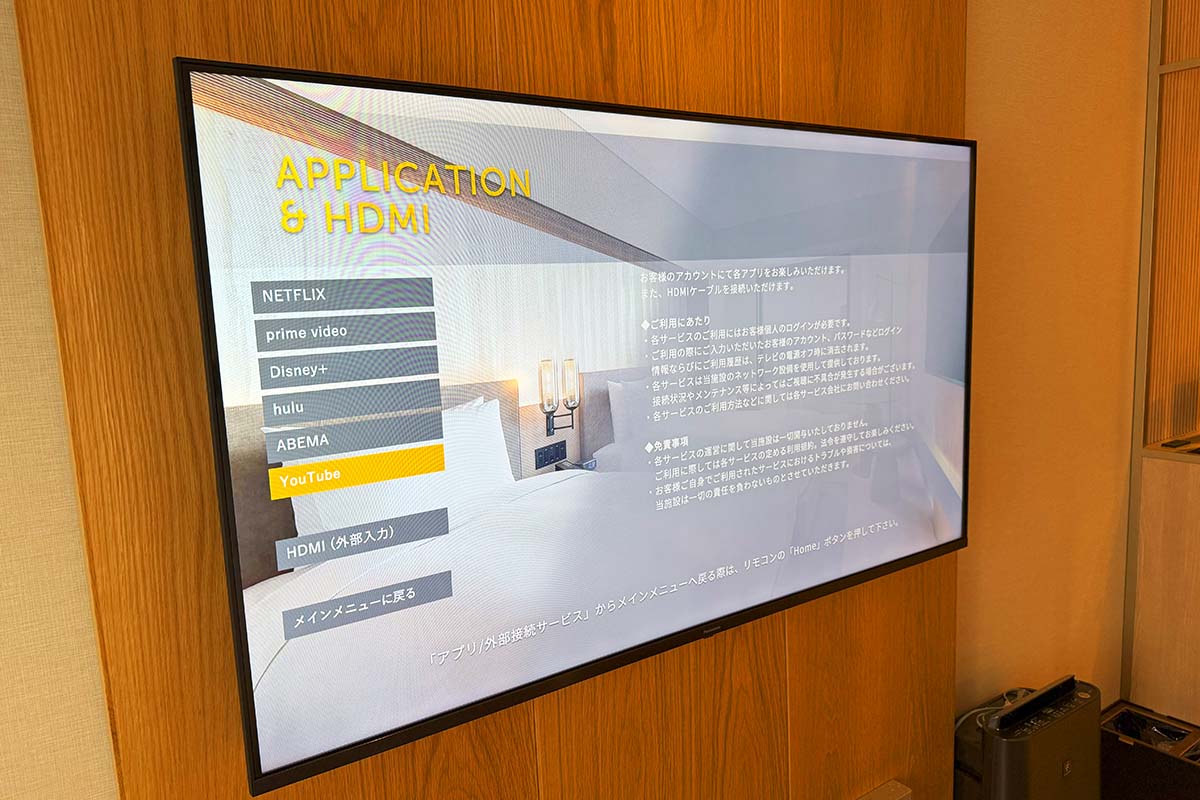 テレビについてはYouTube、Abema、Netflix、プライムビデオ、hulu、Disney+に対応しており、最新のホテルと言うのを感じます。HDMIケーブルはないので、持参するか、フロントに行けば借りられるかもしれません。