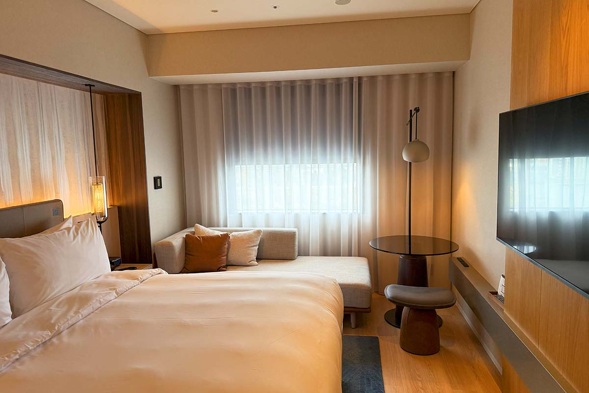 と言う事で、今回は高層階のデラックスルームでした。できるだけのアップグレードはしていただいたという感じでしょうか。1キングベッドにカウチソファ、ガラス丸テーブルがあり、フェアフィールドにも似ている感じではあります。ディテールを見ていきます。