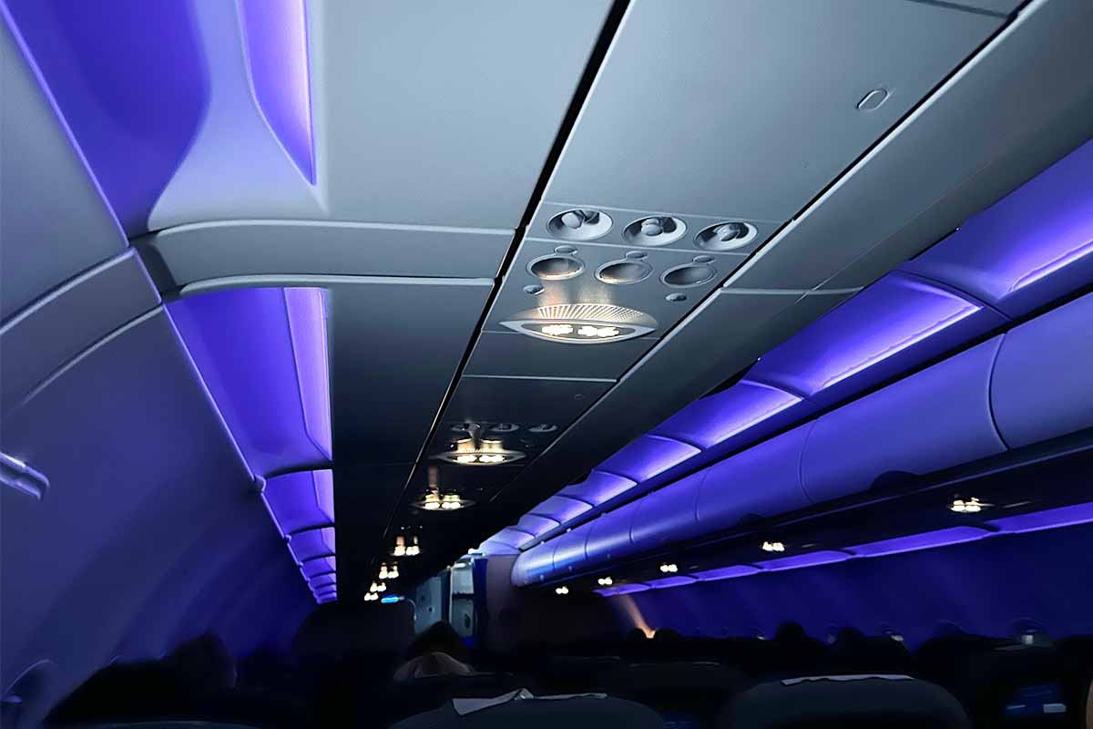 本格的なお眠りモードであります。旅客機は四半世紀ぐらい、見かけはあまり変化していませんが、照明は随分進化したと言えます。以前はベルトサインの電球以外は消灯すると明かりは有りませんでしたが、現在ではこうしてLEDで心理的な効果を出すまでに至っています。