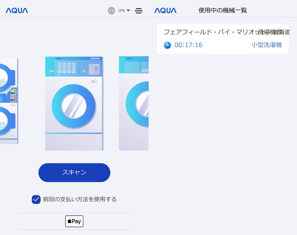 支払いはクレジットカードやPayPayなどができるほか、Apple Payも利用できます。Apple Payでもともとクレジットカード紐づけがあるとスマホの右サイドのボタンをダブルクリックすれば簡単に決済ができるので簡単であります。決済のあと2秒後ぐらいには洗濯機が始動しだしました。