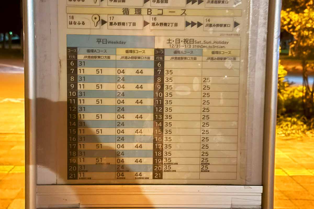 ちなみにここにはコミュニティバスのバス停があり、恵み野駅、恵庭駅にアクセスしており、1時間1本程はあるので、そのタイミングをねらってチェックイン、チェックアウトするのが良いでしょう。