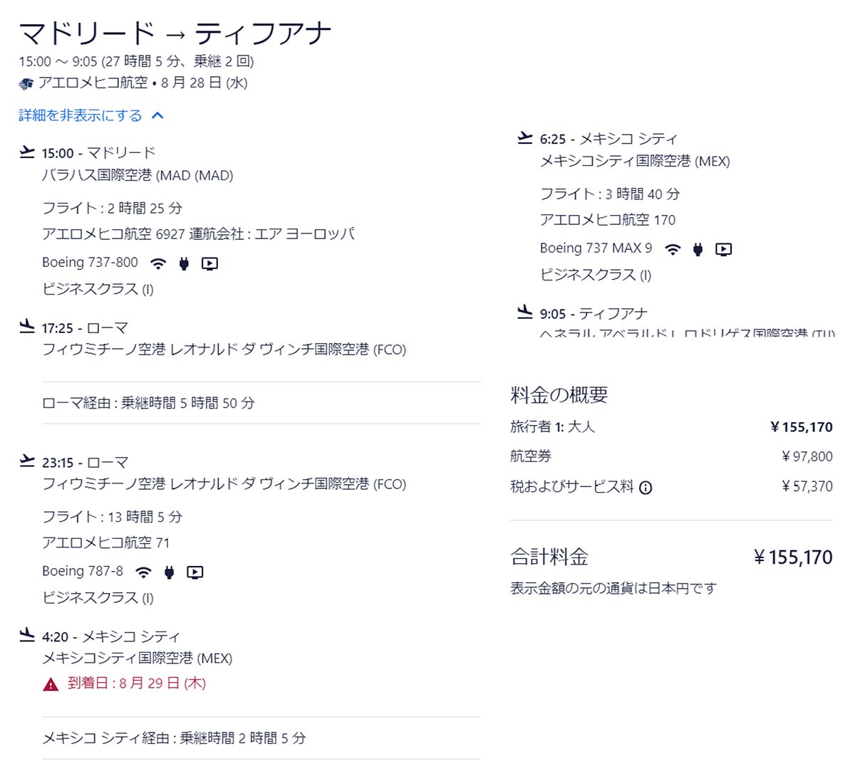 今回は8月後半からマドリードからティファナまでルートであります。エアーヨーロッパでローマまで行き、そこからアエロメヒコでメキシコシティに行き、アエロメヒコ国内線でティファナに行くルートであります。