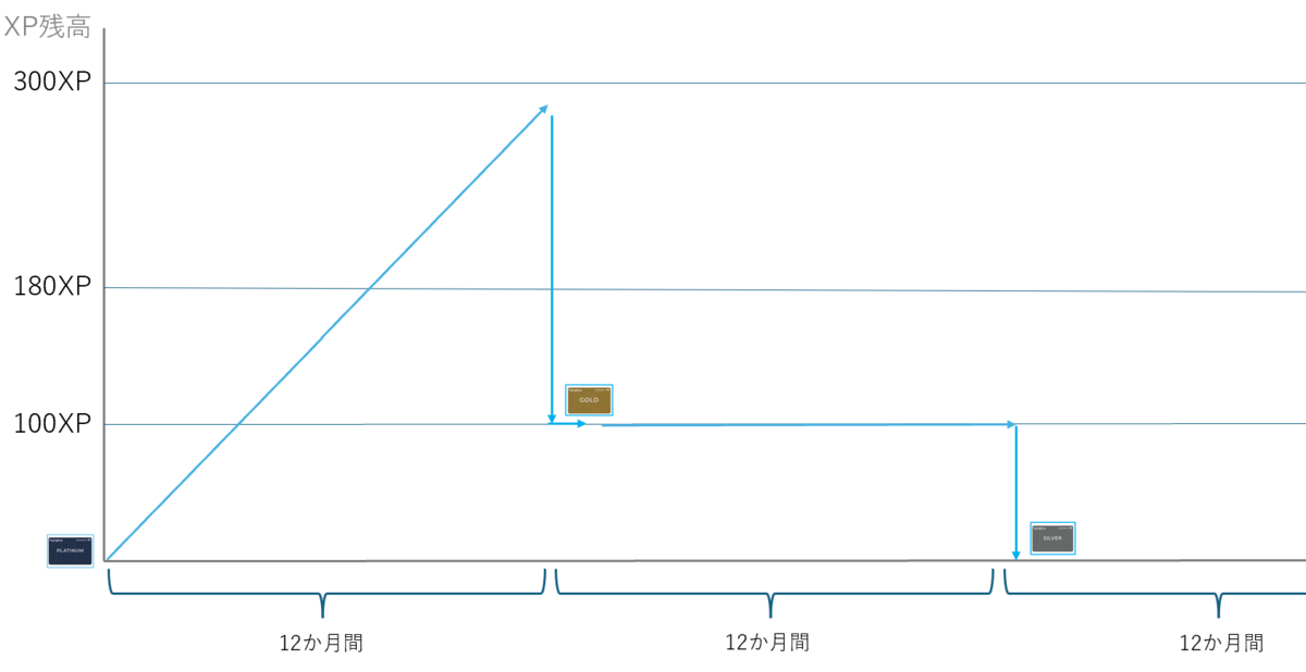 こうして、100XP+180XP+300XP=580XPを12か月間の間に達成し、プラチナに到達してハッピーではありますが、12か月が過ぎると残高はリセットされます。300XP以上の残高を持っていれば最大300XPまでは繰り越されるます。言い方を変えると600XPまで12か月間に稼ぐと、プラチナ分の300XPは差し引かれるものの、繰り越しは300XPまでは担保されます。そして、翌年もプラチナ確定となります。