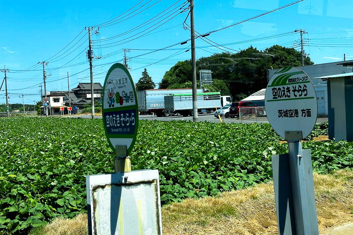 所要時間は石岡駅から35分であり、空港の一つ手前のバス停には空のえき そららがありました。空のえきとはありますが、実質的には道の駅な感じでした。空港から歩くと1km位の距離です。バス乗客は自分を含めて、石岡駅から茨城空港でしたが、一人だけ途中から野菜を積んだ段ボールを抱えたおじいちゃんが乗車し、空のえきで降りていきました。納品ですかね。
