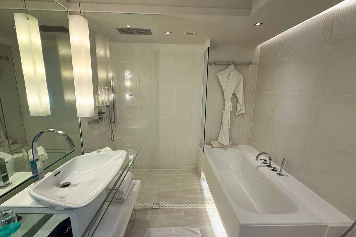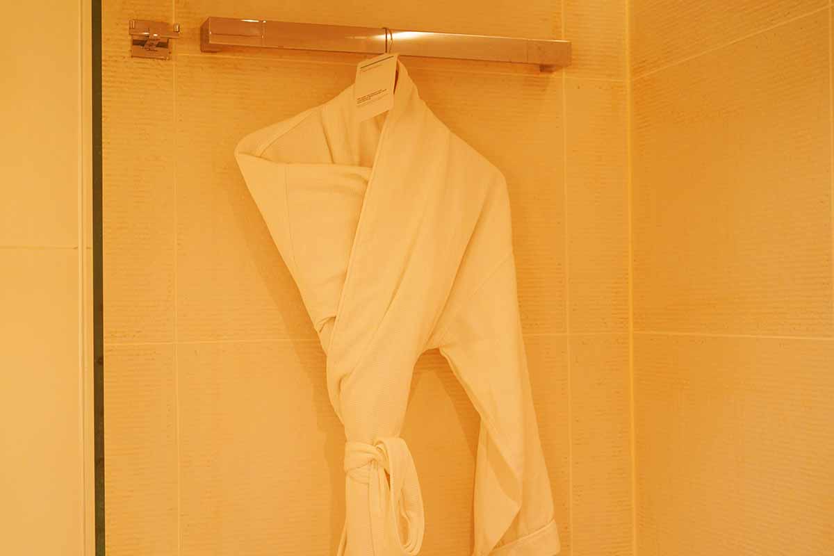 バスルームは白一色の清潔感漂う雰囲気です。バスタブは足を延ばせる浅めのタイプでした。バスルームにもガウンがあります。
