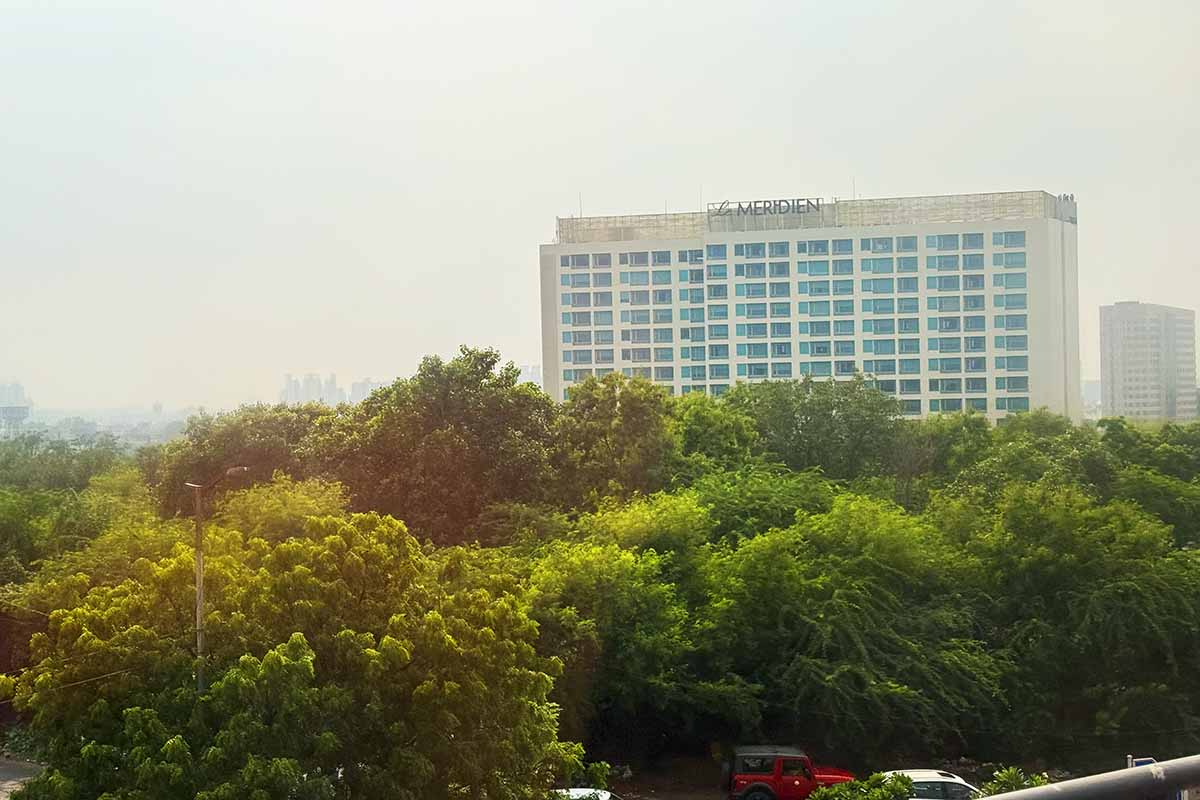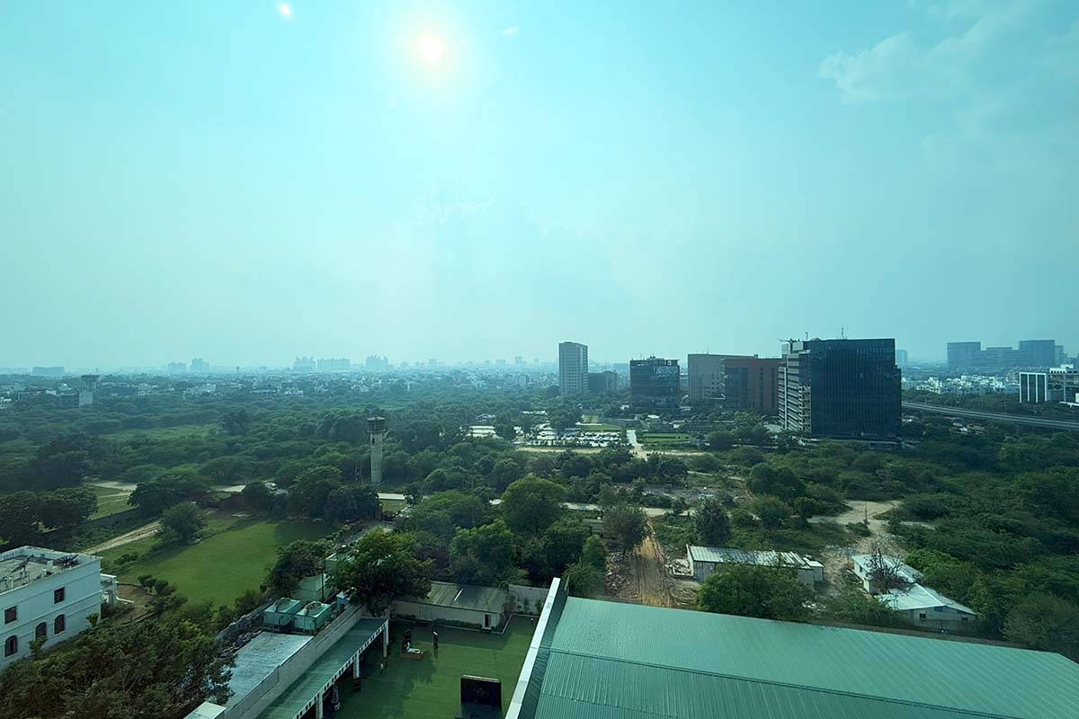 地下鉄と言ってもホテル付近のエリアは高架を走るので、ホテルがはっきりと見えます。IT企業が進出しており、高層ビルも多いのですが、ビルとビルの間の空き地や歩道の舗装は未整備箇所が多く、歩くと砂塵が結構すごく、空気もあまりきれいな感じではありませんでした。インドらしくクラクションの音が秋の虫のようにひっきりなしでした。