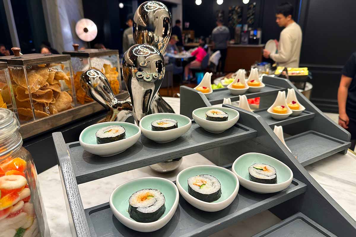 エクセレントとまでは行きませんが、巻きずしやちょっとしたカナッペ、鶏肉の煮物などホットミールも存在しました。