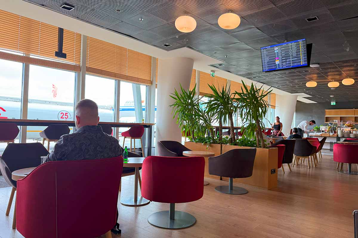 ラウンジ全景です。LOTの本拠地の長距離国際線では中型機が就航している路線が多いところにあるラウンジとしてはちょっとこじんまりとしています。殺伐としていない昼沙陰りです。