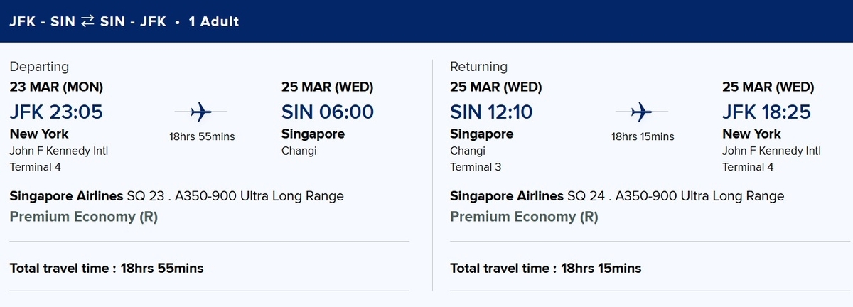 今回の日付は2026年3月であり、23日月曜日にニューヨークを出発して、約19時間後の25日にシンガポールに到着します。復路は6時間後の25日お昼の12:10に出発し、18時間超のフライトの後に同日の18:25にJFKに到着します。フライトは2レグのみですが、世界最長路線を2回経験することとなります。ほとんど2日間空中ににいるような旅程です。