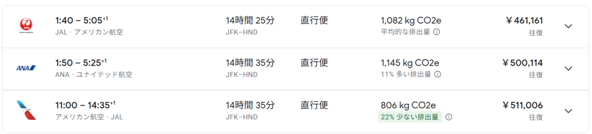 ちなみに、エコノミーの場合は仁川経由のアシアナ航空が16万円、台北経由のエバー航空が18万円と安くなっていますが、東京直行だとJALが25万円、アメリカン航空が24万円とエコノミーなのに高くなっています。
