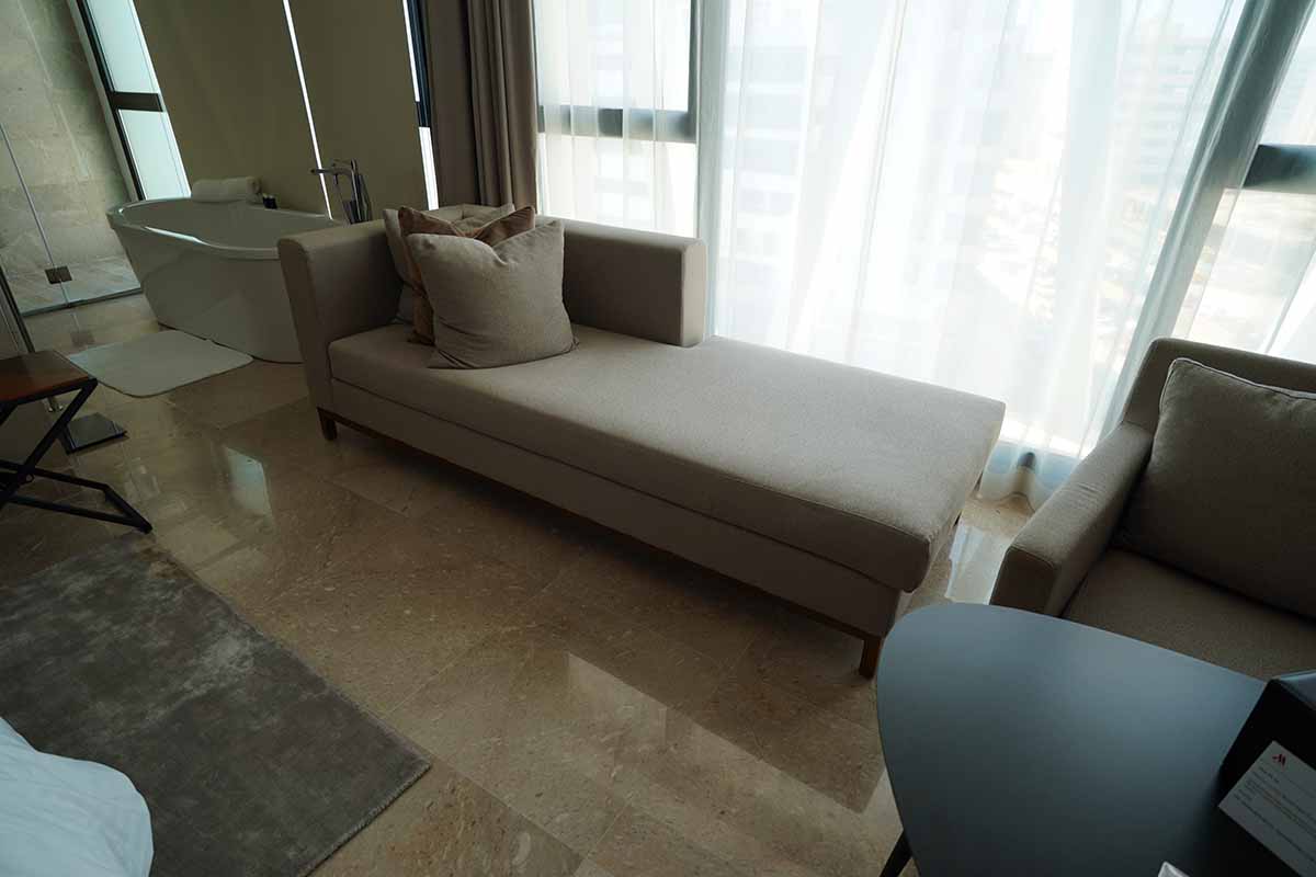大きな窓の横にはソファがあります。となりのソファはパソコン作業用であります。この辺りが日中はいる場所であります。奥はシームレスにバスルームとなっています。この辺りもスイート?と感じてしまいます。