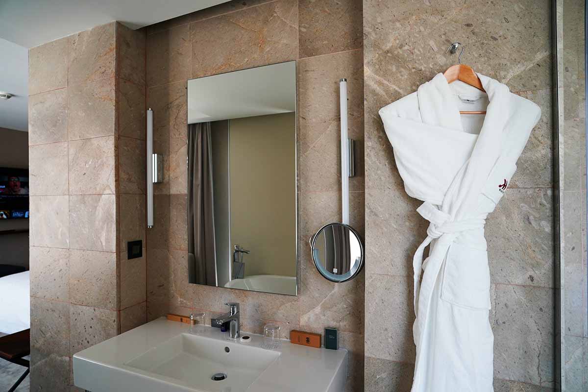 続いてはバスルームであります。スイートではありますが、リビングから遮るもののないオーブな空間であります。排水溝のにおいがするとやってられませんがそうした事はありませんでした。バスルームはほとんどガラス張りでありますが、すべてフロスト加工されており、裸でもプライバシーは気になりません。