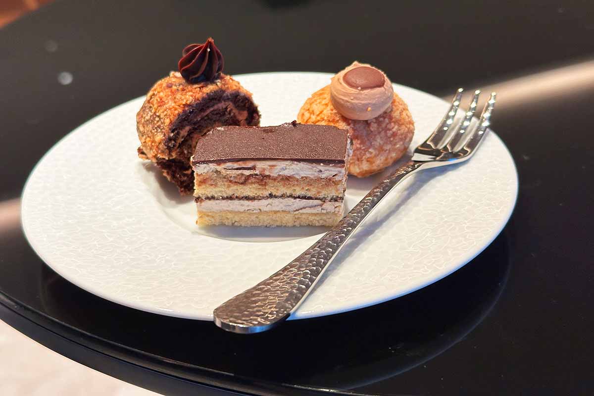 ウェルカムスイーツはチョコとマカロンと言った感じです。ガラスの容器に入ったのは味は美味しいのですが、どんな目的のスイーツか不明でした。なんとなく、五平餅に塗られている甘いゴマな感じでした。