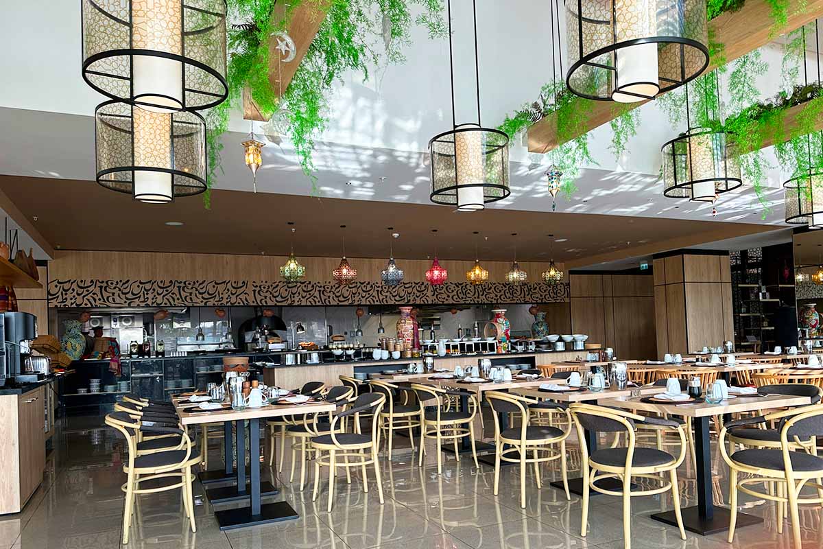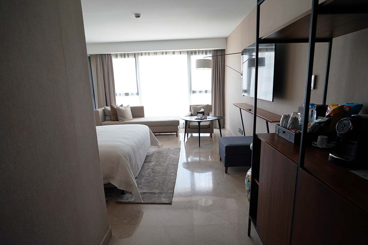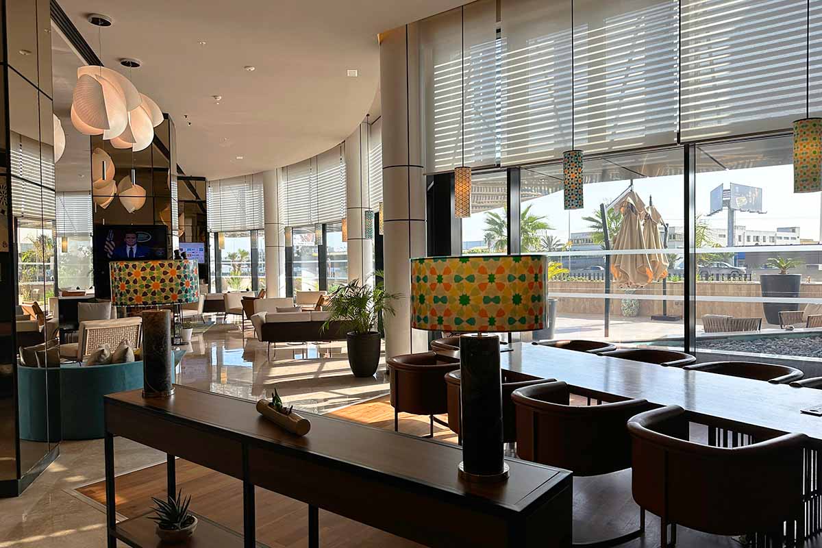 マリオットホテルとしては比較的コンパクトであり、ロビーもコンパクトであります。エントランスにはアラブ的であり、金属探知機があったりします。