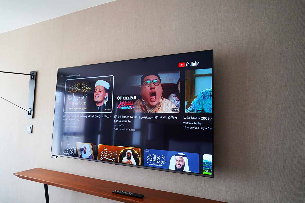 テレビはスマートテレビ対応であり、リモコンだけでYouTubeが見られました。デフォルトはアラブチックではありますが、日本語検索もできて日常と変わりませんでした。