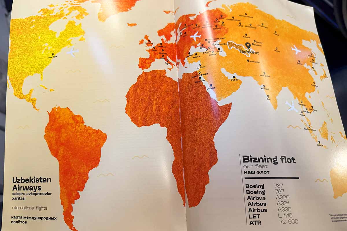 中身は自社のサービスに関するものが多い感じでした。ウズベキスタン航空は西はニューヨーク、東は成田まで就航しており、成田は週2便飛んでいるようです。機材はB787-8と言う事です。