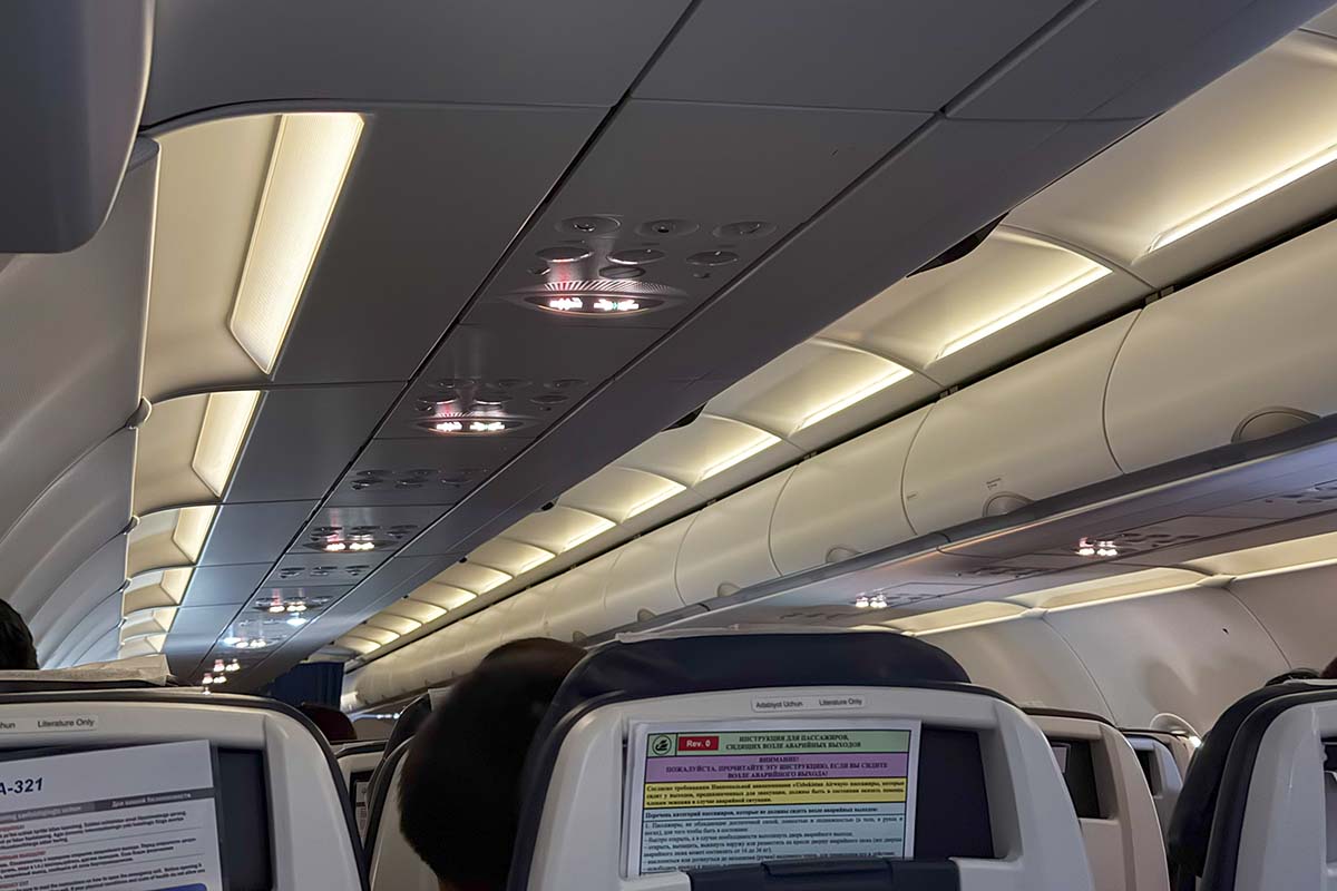 機材はA321であります。シートモニターはないものの、USB電源はあり、古いのか新しいのかよくわからない感じです。短距離仕様の機材と思われます。