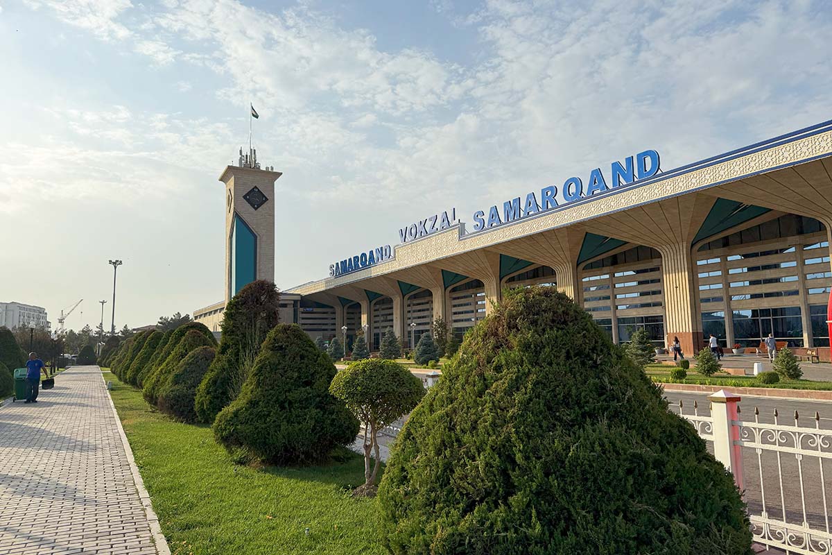 さて、時間は経ち、サマルカンドの滞在を終えて、再びタシケントに戻ります。サマルカンド駅も立派な駅舎でありますが、手荷物検査があり、乗客しか乗れません。