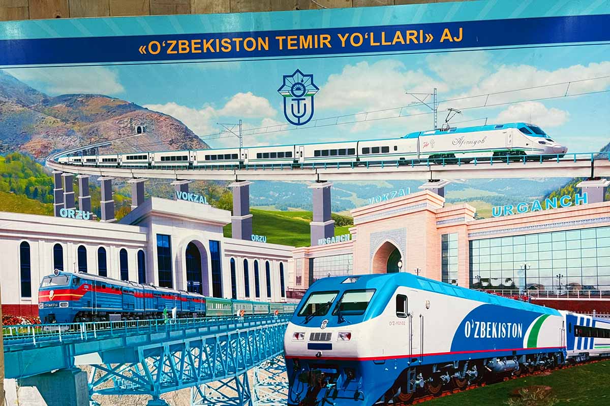 ウズベキスタン鉄道のが描かれたポスターがありました。延伸計画が書いているようでしたが、どの区間かは不明でした。タシケントとサマルカンド間はすべてタルゴの運行かと思うとそうではなく、従来ながらの機関車牽引の列車も多く、そうした列車の所要時間は4時間超となり、限られた時間で観光する海外旅行者にとってはちょっと厳しいところでもあります。