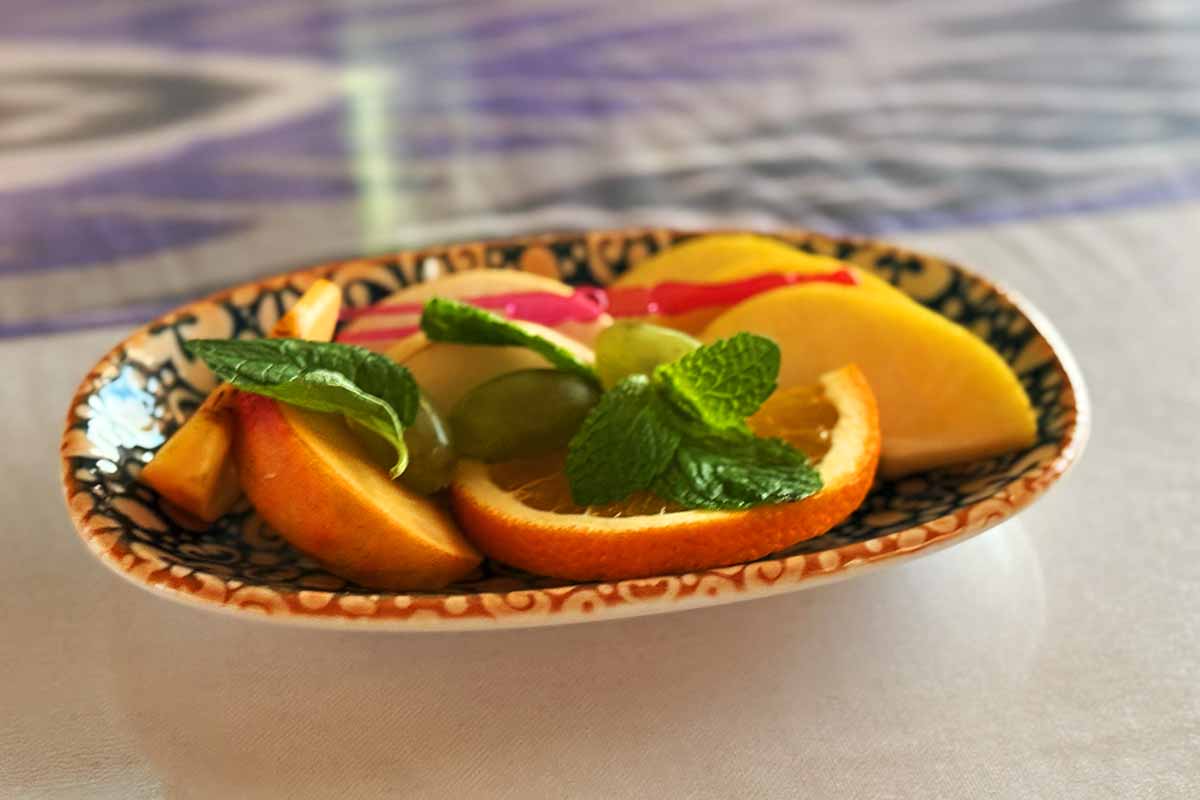 食後のデザートはフルーツ盛り合わせでした。オレンジとリンゴと梨にミントが載せられているのが海外と言った感じです。食器の感じからも結構、運賃の割に高級感と旅行感を感じて楽しかったです。